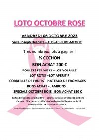 LOTO OCTOBRE ROSE NOMBREUX LOTS A GAGNER. Ouverture des portes à 18h30. Buvette et restauration sur place.