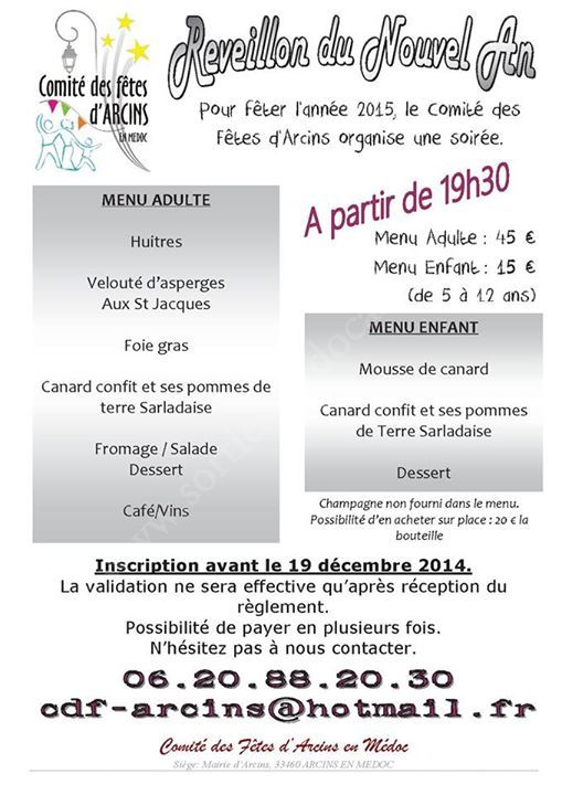 Pour fêter l'année 2015, le Comité des Fêtes d'Arcins organise une soirée pour le réveillon du Nouvel An.