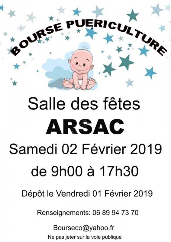 La Bourse puériculture et vêtements enfants de 0 à 16 ans d'Arsac aura lieu le 1/2/3 février 2019, à la salle des fêtes.