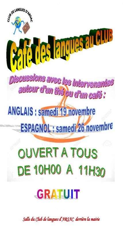 Pour la première fois à Arsac, le Club de Langues organise deux matinées ouvertes à tous pour le plaisir de converser en anglais et en espagnol autour d’une tasse de thé ou de café.