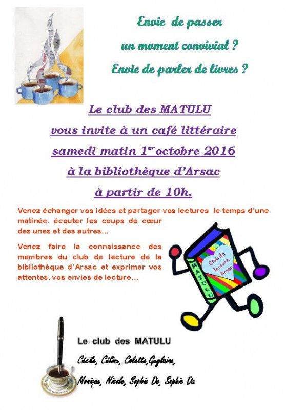 Les "Matulu", membres du club lecture de la bibliothèque, vous invitent à un café littéraire le samedi 1er octobre 2016.