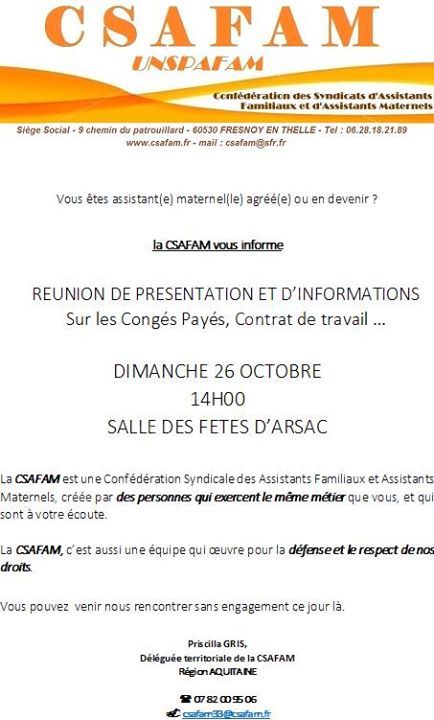 La CSAFAM vous invite à une réunion de présentation et d'informations traitant des congés payés, contrat de travail, ...