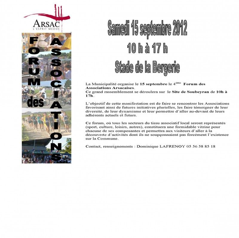 La Municipalité organise le Forum des Associations Arsacaises. Ce grand rassemblement se déroulera sur le Site de Soubeyran de 10h à 17h.