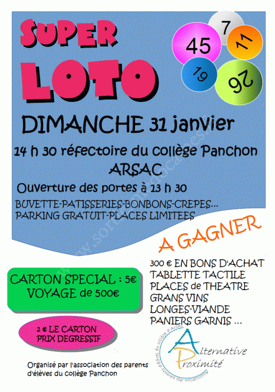 L'association des parents d'élèves du collège d'Arsac organise un loto dans le réfectoire du collège, le dimanche 31 janvier 2016 à 14h30.
