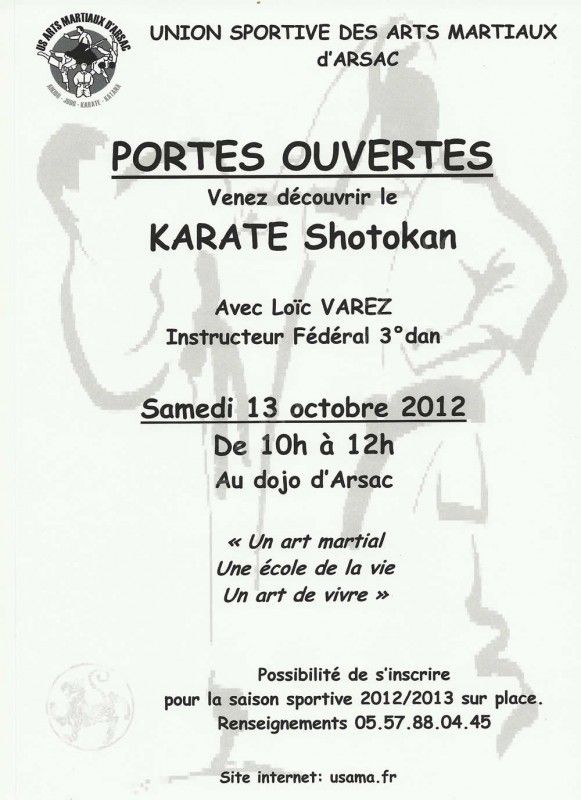 L'Union Sportive des Arts Martiaux d'Arsac vous invite à découvrir le Karaté Shotokan lors de ses portes ouvertes avec Loïc Varez (instructeur fédéral 3° dan).