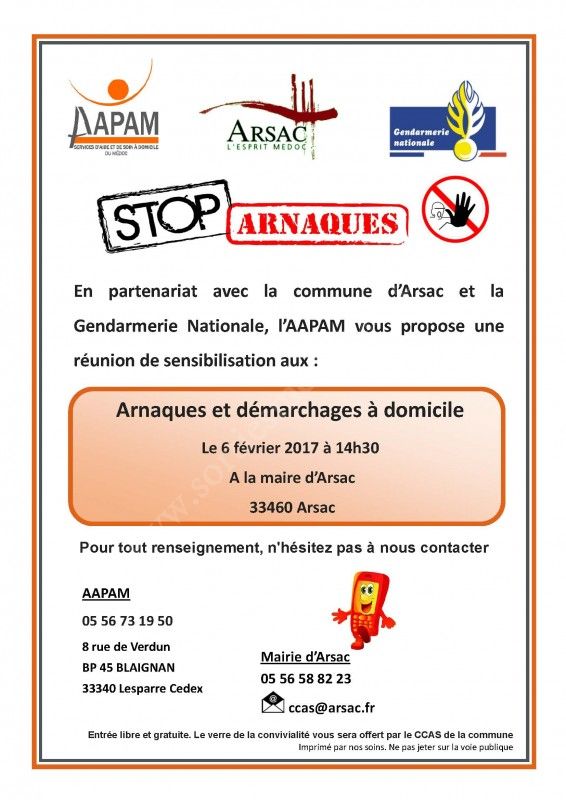 En partenariat avec la commune d’Arsac et la Gendarmerie Nationale, l’AAPAM vous propose une réunion de sensibilisation aux : "Arnaques et démarchages à domicile".