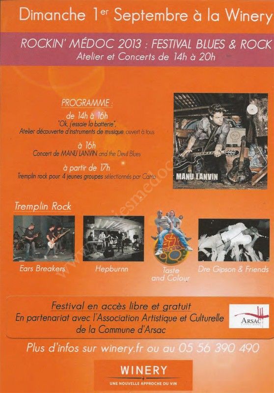 ROCKIN’ MEDOC, c’est un festival créé en 2010 par CANTO, association d’Arsac, toujours à la recherche de jeunes pousses musicales à tendance "rock de la région". Les années passant, ce petit festival a réussi à programmer la venue de groupes tels que Anomalyst (vainqueur du tremplin rock Bordeaux 2010), Agathe Ze Blues, Jafly (vainqueur du tremplin rock Blanquefort) ou Starsheep Groovers que l’on ne présente plus…Bref, du beau monde ! Cette année pour l’édition n°4, ROCKIN’ MEDOC voit plus grand et s’associe à la WINERY, site dédié au monde du vin et à la découverte culturelle, pour offrir à toutes les oreilles un après-midi Blues, rock et chaises longues qu’on n'oubliera pas de si tôt !