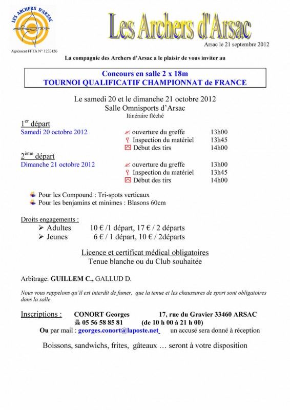La compagnie des Archers d’Arsac a le plaisir de vous inviter au Concours en salle 2 x 18m : Tournoi Qualificatif Championnat de France.