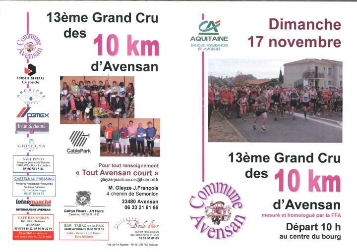 Cette année 2013, se déroulera la 13ème édition des 10 km d'Avensan. Comme les années précédentes, nous vous attendons très nombreux pour cette réunion sportive le dimanche 17 novembre pour un départ à 10h00.