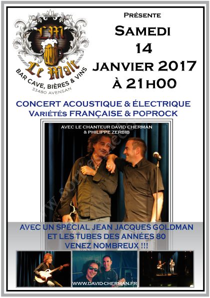 Concert pop électro, reprise Jean-Jacques GOLDMAN er chansons années 80, soirée super dansante assurée par David CHERMAN et son groupe, à ne pas manquer pour les inconditionnels de musique Française.