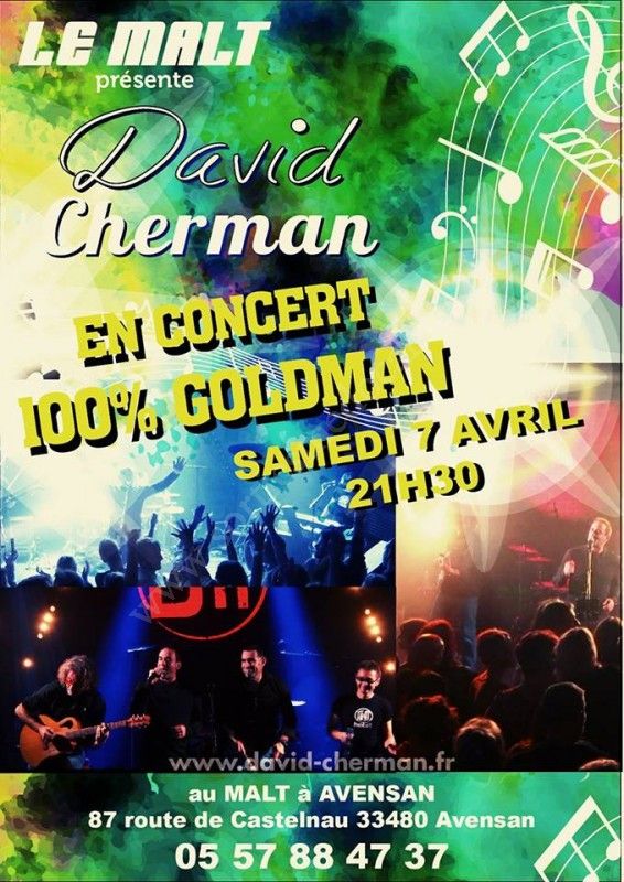 Samedi 7 Avril 2018, au MALT, concert David CHERMAN et son groupe pour de la musique 100% GOLDMAN, ambiance et bonne musique assuré, venez danser sur les meilleurs titres d'une icône de la chanson Française.