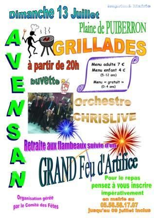 Le repas du 13 juillet à 20h00 se déroulera à la plaine des sports, organisé sous le patronage du comité des fêtes et en collaboration avec les associations de la commune. Il sera suivi du traditionnel feu d'artifice, à 23h00, précédé par la retraite aux flambeaux animée par les enfants et ponctué par une soirée dansante avec comme maître de cérémonie le groupe ChrisLive.