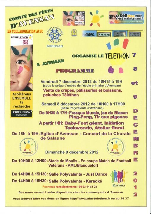 - Vendredi, de 16h15 à 19h, vente de crêpes, pâtisseries, boissons, peluches Téléthon, sous le préau d'entrée de l'école primaire d'Avensan.