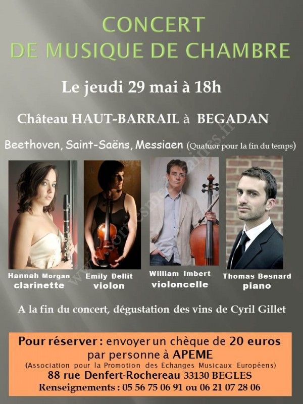 Concert de musique de chambre qui aura lieu au Château Haut-Barrail, chez Cyril Gillet, qui sera suivi d'une dégustation des vins du château.