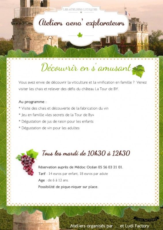 Rentrez dans les coulisses d’un château du Médoc ! En compagnie du sommelier, découvrez les secrets d’un château authentique : cuviers, chais… A vous de jouer ! Relevez, en famille, les énigmes et défis du château. A chacun sa dégustation : les enfants, initiez-vous à la dégustation de jus de raisin pendant que vos parents dégusteront les vins de la propriété sous les conseils du sommelier.