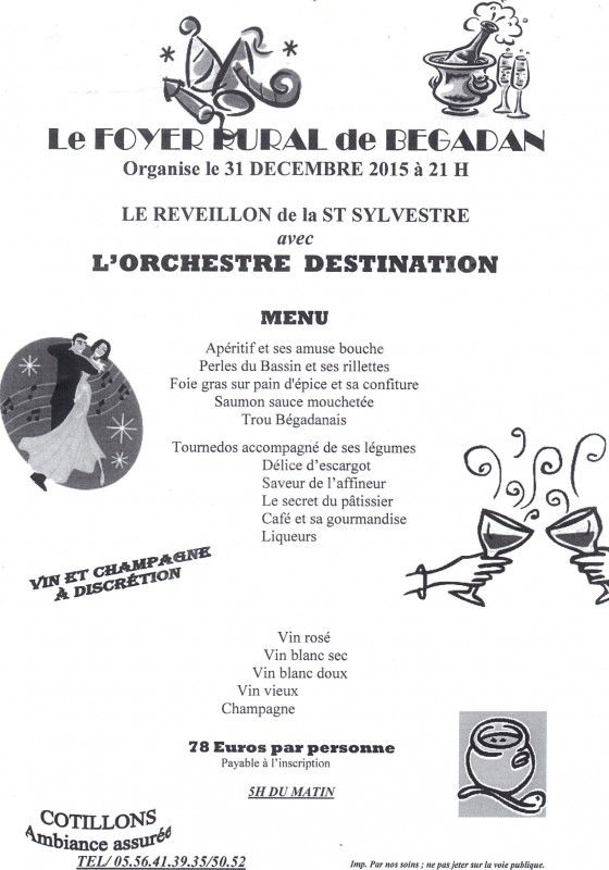 Le FOYER RURAL de BEGADAN organise LE REVEILLON DE LA ST SYLVESTRE avec L'ORCHESTRE DESTINATION.