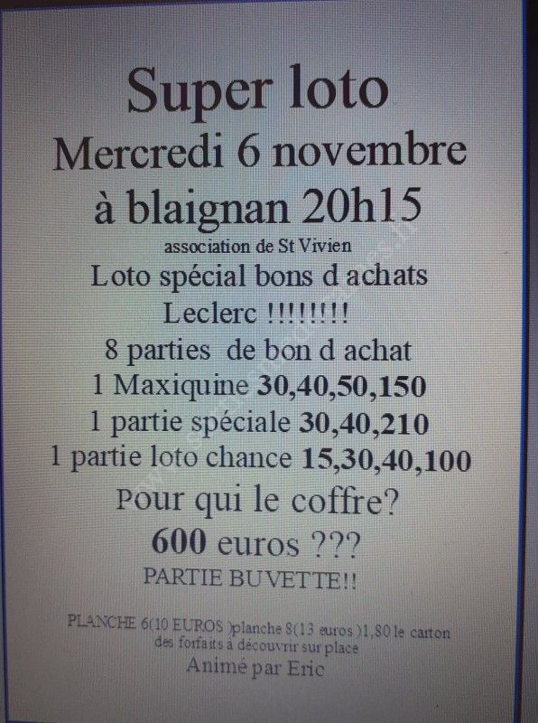 Super loto spécial bons d'achat leclerc organisé par l'Association St-Vivien et animé par Eric !