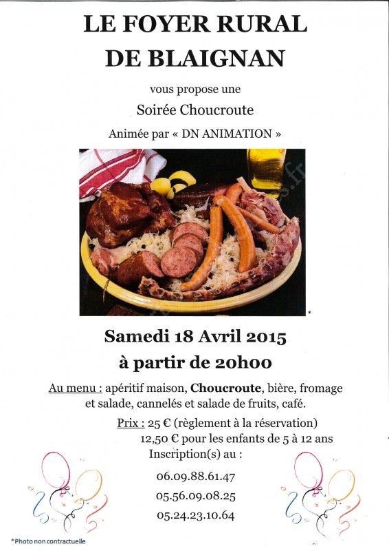 LE FOYER RURAL DE BLAIGNAN ORGANISE UNE SOIREE CHOUCROUTE LE SAMEDI 18 AVRIL ANIMEE PAR "DN ANIMATION".