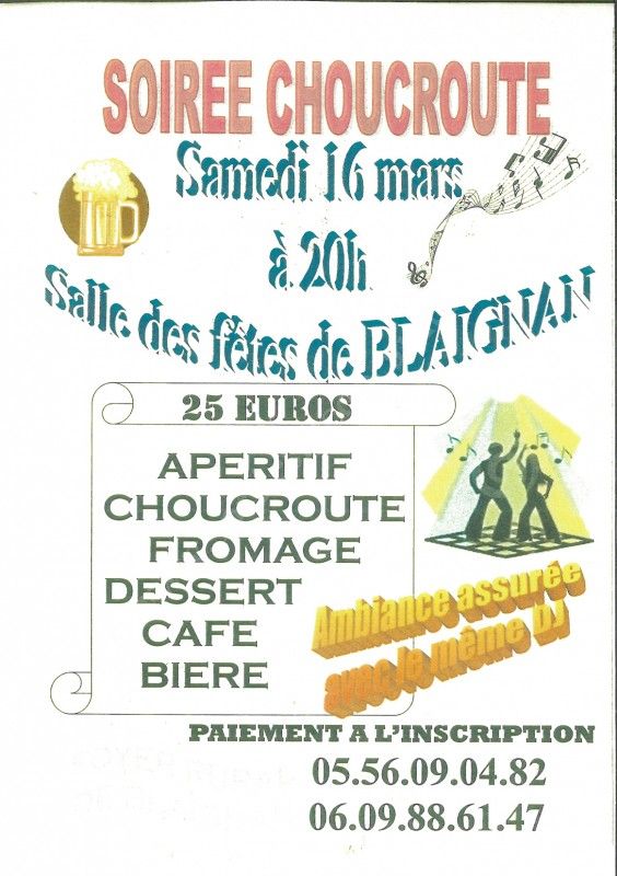 LE FOYER RURAL DE BLAIGNAN ORGANISE UNE SOIREE CHOUCROUTE LE SAMEDI 16 MARS A 20 H A LA SALLE DES FETES.