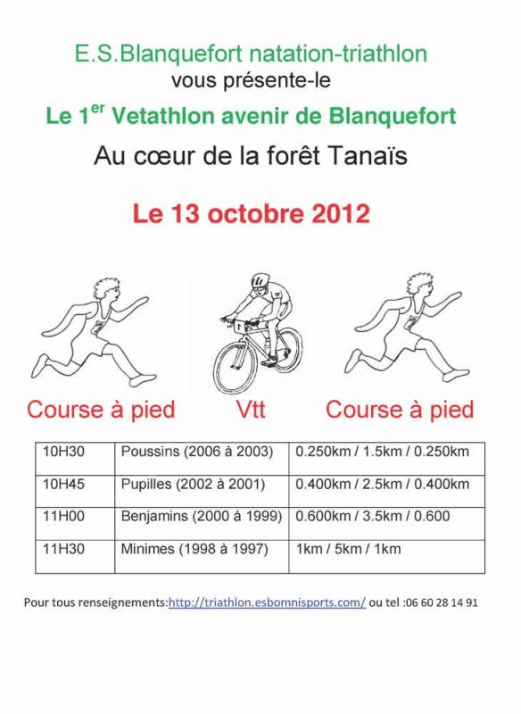 L'ESB Natation-Triathlon organise le 1er Vétathlon vert de Blanquefort : Course à pied – VTT – Course à pied, au coeur de la forêt de Tanaïs pour les enfants de 2006 à 1997 (distances variables selon les catégories)