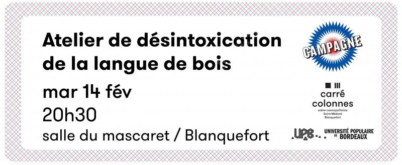 Dans le cadre du projet CAMPAGNE, le Carré-Colonnes en partenariat avec l'Université Populaire de Bordeaux vous proposent un ATELIER DE DÉSINTOXICATION DE LA LANGUE DE BOIS