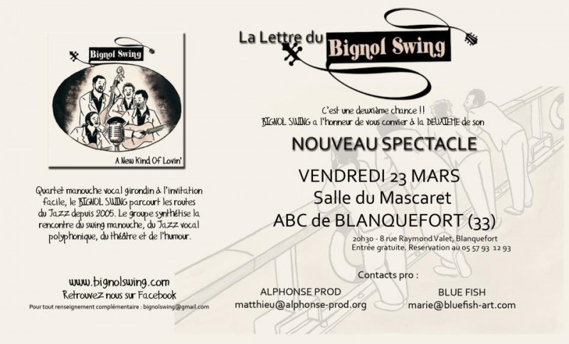 Le Bignol Swing met en avant la part "spéctacle vivant" d'un concert. Au musical s'ajoute le coté visuel et humouristique. Les musiciens s'amusent, prennent plaisir sur scène, et partagent ce plaisir avec le public, pendant et entre les chansons.