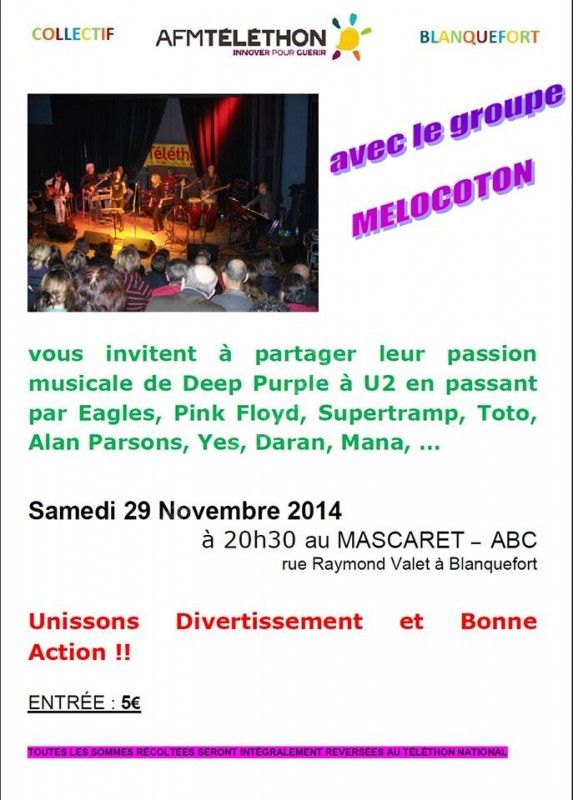 Le collectif AFM Blanquefort et le groupe Melocoton vous invite à partager leur passion musicale de Deep Purple à U2, en passant par Eagles, Pink Floyd, Supertramp, Toto, Alan Parsons, Yes, Daran, Mana, ...