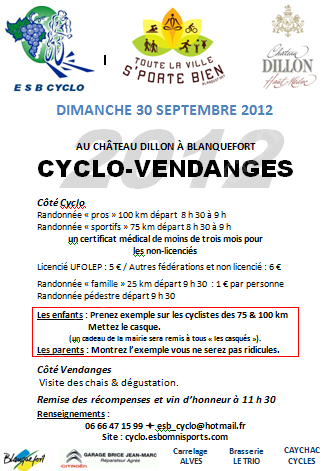 - Randonnée "Pros" : Départ de 8h30 à 9h pour un circuit de 100 km pour cyclos pratiquants de bon niveau qui serpentera au milieu des vignes du Médoc jusqu’aux alentours de la commune de Pauillac. (Certificat médical obligatoire datant de moins de 3mois pour les non-licenciés.)