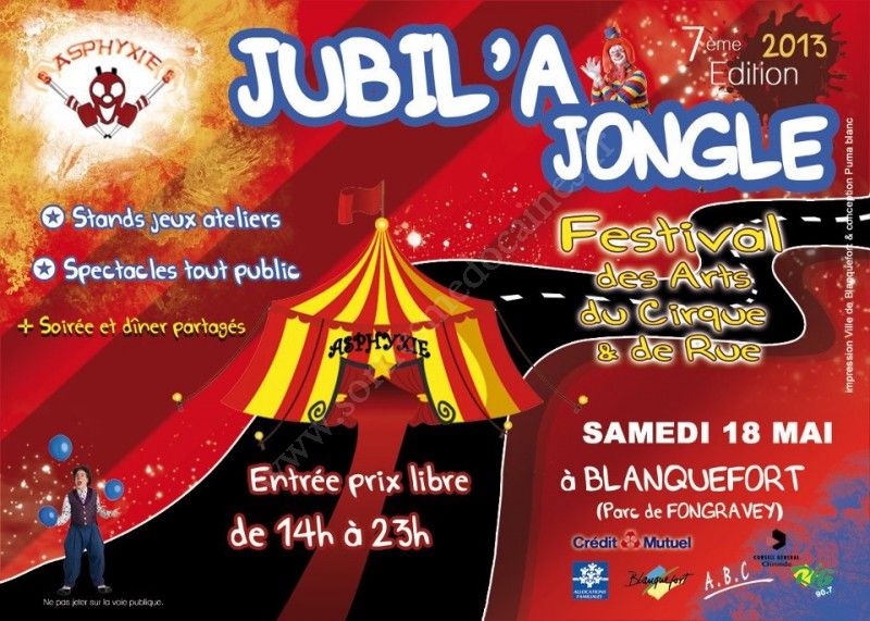 Le festival est un concentré d'énergies artistiques circassiennes. Convivialité, pratique, transmission, échange, etc. sont la force de cette grande fête des arts du cirque & de rue à partager entre tous. Alors entre amis ou en famille, de 14h à 23h, fêtons l'anniversaire de l'association avec le JUBILAJONGLE !