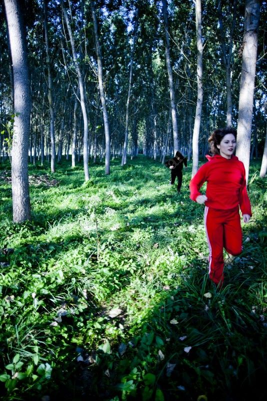 Sur scène, le Chaperon (en jogging rouge) court à en perdre haleine, affrontant la pénombre et le vent en s’engouffrant dans une sinistre forêt. Le Petit Chaperon Rouge fuit, encore et encore, rampe, se terre… jusqu’à l’irruption du Loup (en survêtement noir), présence menaçante, mais aussi étrangement magnétique.