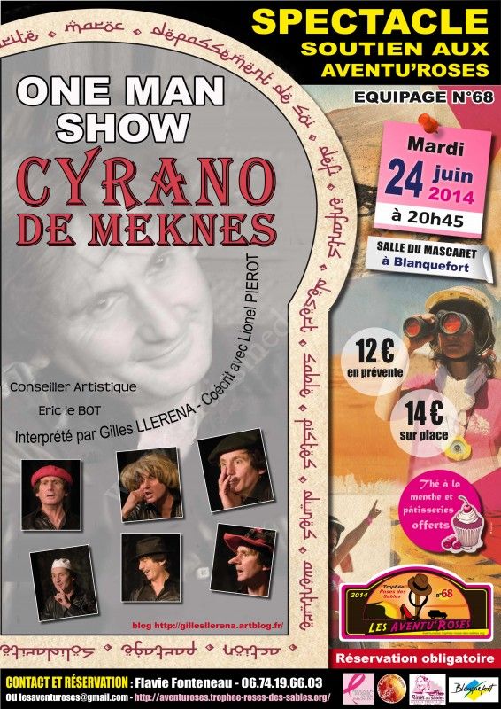 Afin de pouvoir prendre le départ de la 14° édition du Trophée Roses des sables, Les Aventu’Roses, équipage n° 68, vous propose un one man show : Cyrano de Meknès de et avec Gilles Llerena le mardi 24 Juin à 20h45 à la salle du Mascaret à Blanquefort.
