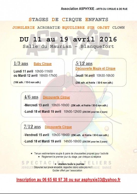L'association Asphyxie propose des stages de cirque pour tous les enfants durant les vacances d'avril.