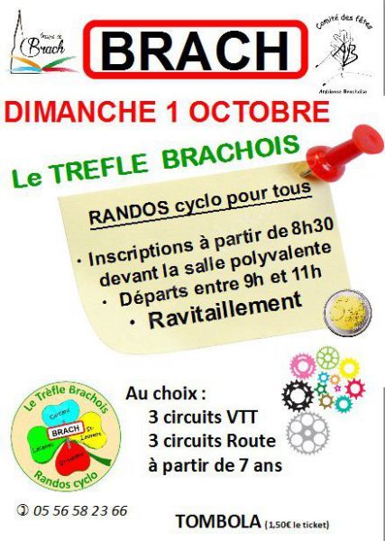 Pour la 5ème année, la municipalité et l'Ambiance Brachoise vous proposent dimanche 1er octobre son Trèfle Brachois avec ses circuits cyclo pour tous à partir de 7 ans.