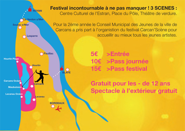 Carcan'Scène est soutenu par le Conseil Régional d'Aquitaine, le Conseil Général de la Gironde, la FNCTA, Le Centre leclerc Lesparre et l'association Art et Culture.