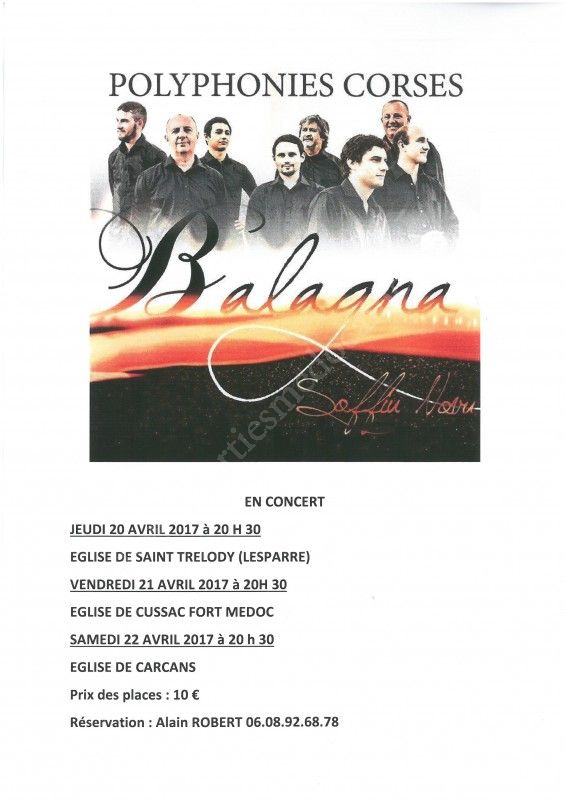 L’amour de la langue corse et de leur région de Balagne, une envie de partage et de qualité unit les membres du groupe BALAGNA, issus Pour la plus grande part d'entre eux du même village. Depuis plus de trois saisons, ils offrent des concerts d’une rare richesse, tant par la variété des thèmes que des registres abordés. Chants traditionnels sacrés et profanes, pages contemporaines, créations… vous êtes guidés dans la forêt de ces différents univers musicaux par des explications, des anecdotes, des retours savants et cocasses ; les morceaux sont resitués sans lourdeur dans leur contexte. Vous apprenez à décrypter les différents types de polyphonie, de versu ; les monodies viennent apporter le dessin sobre et élégant de leurs mélodies, rompant avec le foisonnement des harmonies polyphoniques. Les voix sont belles et s’accordent en une subtile harmonie. Seconda, terza, bassu, se mêlent, trio, quatuor, quintet, sextet… Les six chanteurs modulent leur groupe selon les exigences et les arrangements des chants. Principal arrangeur Marc'andria CASTELLANI livre des moments de pure virtuosité à la guitare, alternativement accompagné par Christian Ngo Degiovanni ou Ange Arrighi. Les compositions du groupe privilégient les textes de poètes corses contemporains, une des formes littéraires les plus vivantes et populaires sur l’île. Ainsi les créations du groupe s’inscrivent à la fois dans la modernité et dans la veine traditionnelle, et sont servies par les voix superbes de Thierry Nobili et Jean-Mathieu Colombani (seconda è bassu), Jean-Louis Nobili, Christian Ngo Degiovanni, Ange Arrighi, (tous trois seconda è terza). Le chant rythme les étapes de l’existence, les émotions, donne une image de la vie. La convivialité est au rendez-vous, on chante avec les artistes, on rit, on est ému, on rêve, on imagine. Les paysages que l’on déjà admirés prennent une autre dimension, un supplément d’âme.