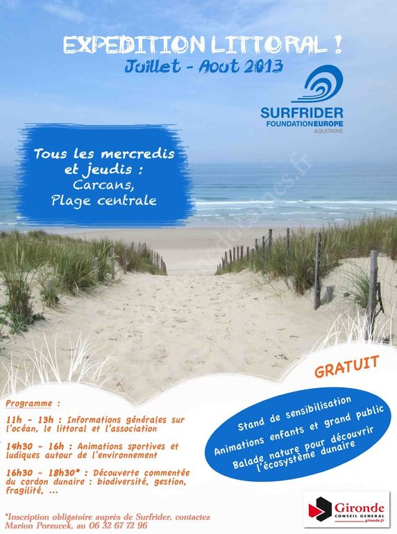 Surfrider Foundation Europe propose tous les mercredis et jeudis de juillet et août 2013 un stand de sensibilisation, des animations pour enfants et grand public, une balade nature pour découvrir l'écosystème dunaire.