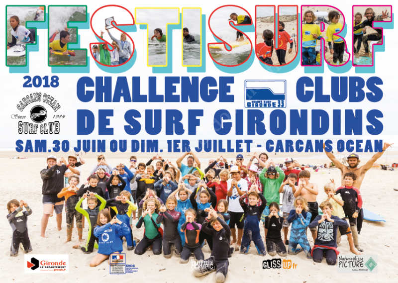 Le challenge des clubs girondins des -12ans 2018, le FestiSurf, se déroulera sur deux étapes cette année, la première accueillie par le Carcans Océan Surf Club le Samedi 30 Juin ou Dimanche 1er Juillet, suivant les conditions de vagues.
