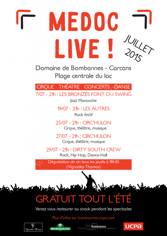 Pour se rendre au Médoc Live ! : après Maubuisson, au rond point menant à Carcans-Plage, prendre la 1ère à droite direction "Domaine de Bombannres". Continuer jusqu'au rond-point à l'entrée du domaine et prendre la première à droite pour rejoindre les parkings proches de la plage centrale.