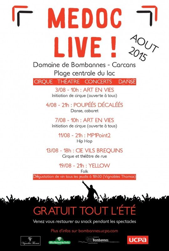 Pour se rendre au Médoc Live ! : après Maubuisson, au rond point menant à Carcans-Plage, prendre la 1ère à droite direction "Domaine de Bombannres". Continuer jusqu'au rond-point à l'entrée du domaine et prendre la première à droite pour rejoindre les parkings proches de la plage centrale.