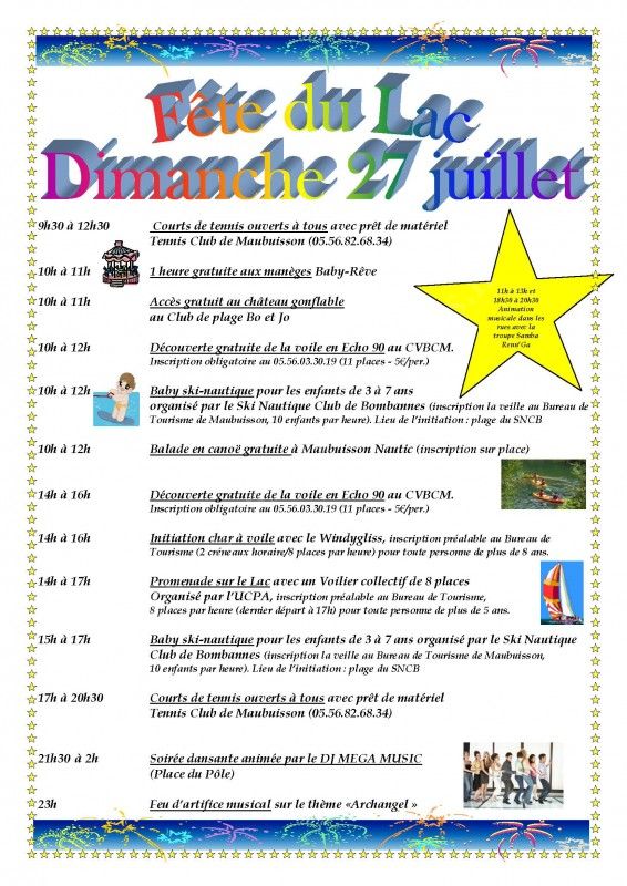 Organisé par l’UCPA, inscription préalable au Bureau de Tourisme, 8 places par heure (dernier départ à 17h) pour toute personne de plus de 5 ans. - 15h00 à 17h00 : Baby ski-nautique pour les enfants de 3 à 7 ans organisé par le Ski Nautique Club de Bombannes (inscription la veille au Bureau de Tourisme de Maubuisson, 10 enfants par heure). Lieu de l’initiation : plage du SNCB