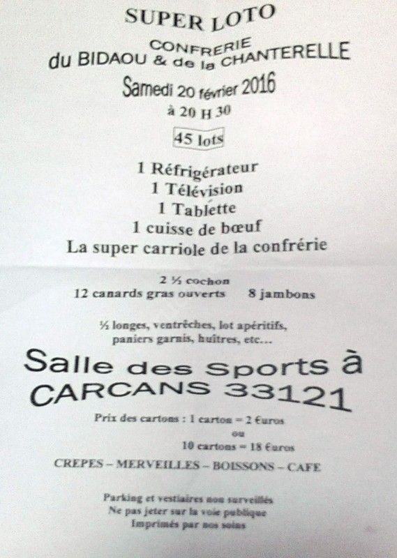 Loto organisé par la Confrérie du Bidaou & de la Chanterelle.