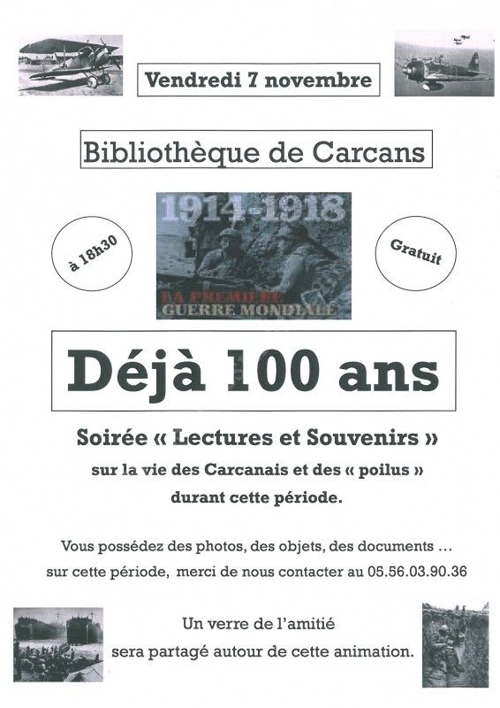 Soirée "Lectures et Souvenirs" sur la vie des Carcanais et des "poilus" durant cette période (1914-1918).