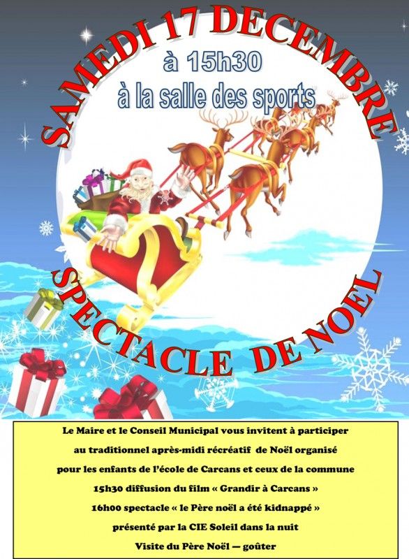 Le Maire et le Conseil Municipal vous invitent à participer au traditionnel après-midi récréatif de Noël organisé pour les enfants de l’école de Carcans et ceux de la commune.