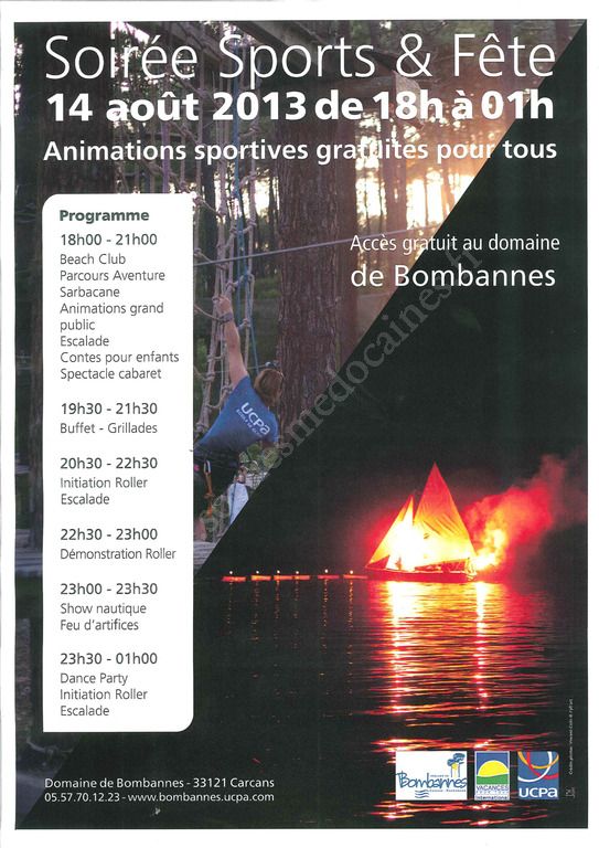 Le Domaine de Bombannes - UCPA organise cette année encore la soirée Sports et Fête, le 14 Août 2013, de 18h00 à 1h00 du matin. Une soirée alliant la découverte sportive et un esprit de fête !