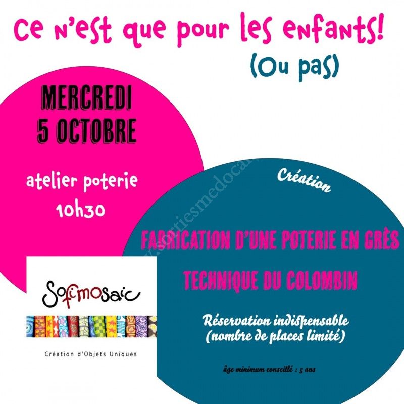 Le mercredi 5 octobre, Sophie de Sofimosaic, créatrice en poterie à Brach, vous propose un atelier parent enfant poterie de 10h30 à 11h30 avec la technique du colombin.