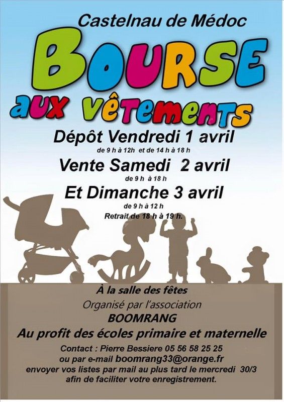 Samedi 2 et dimanche 3 avril 2016, bourse aux vêtements à Castelnau, organisée par l'association "Boomrang", au profit des écoles primaire et maternelle.
