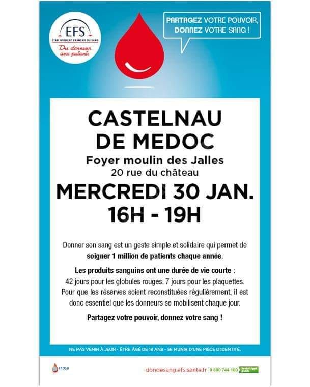 Venez donner votre sang à Castelnau le mercredi 30 janvier 2019, vous pourrez ainsi sauver des vies !!!
