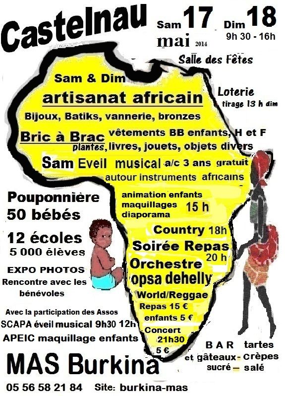 - 15h00 : atelier ‘maquillage enfants’ par l’APEIC, diaporama sur le travail réalisé par l’association au Burkina Faso (12 écoles, 1 pouponnière), dégustation de bissap