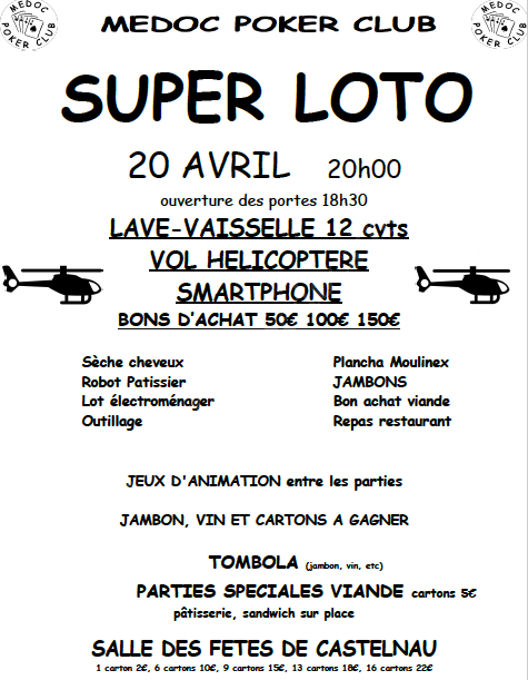 Parties Spéciales Viande, vol en hélicoptère, smartphone, magnum, lot de vin, lot électroménager, jambon, repas restaurant.