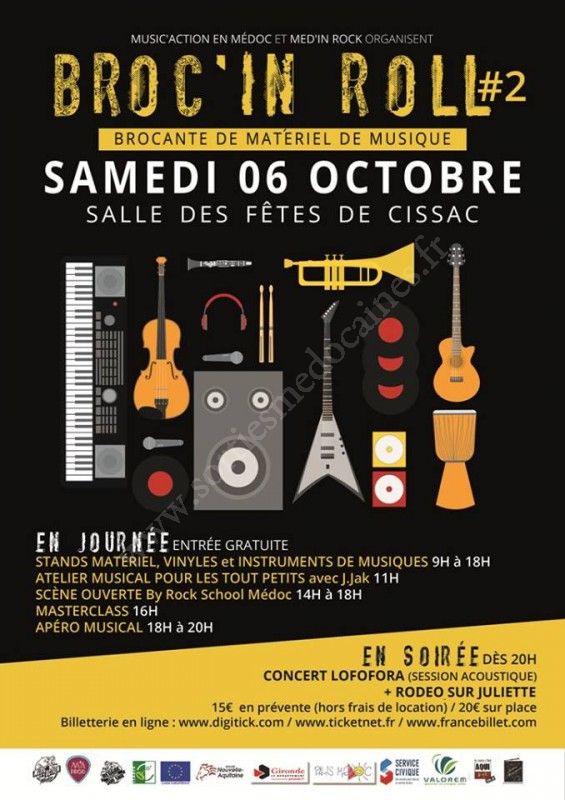 Broc'In Roll number 2.... C'est reparti avec une prog de fou (brocante de matos de zic, concerts, Masterclass, restauration, buvette, atelier musical pour les tous petits). Deux concerts en soirée avec Rodéo sur Juliette et un énorme come back sur Cissac-Médoc du groupe Lofofora !!!!